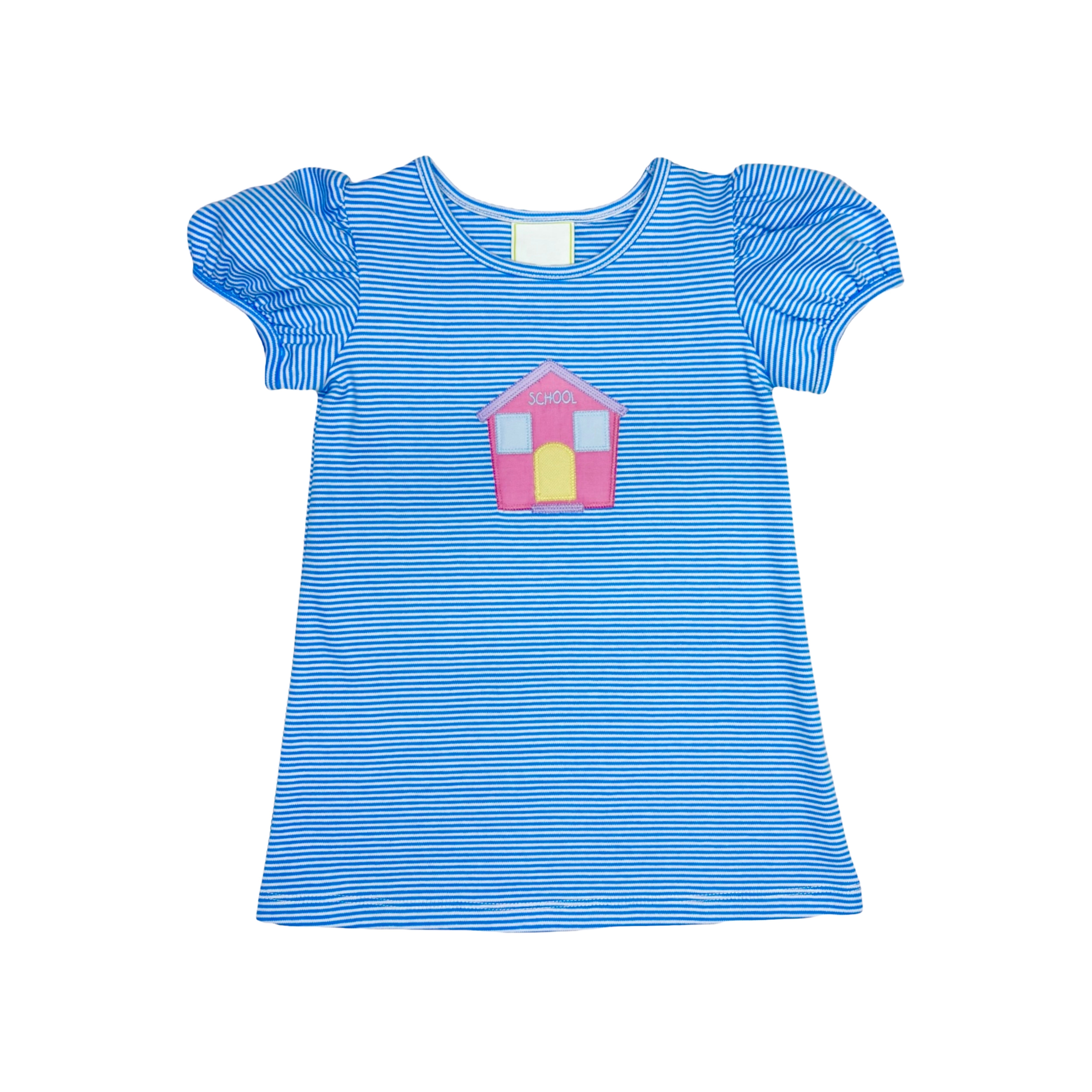 Light blue knit dress with a playful school appliqué—comfy, classic, and full of charm!