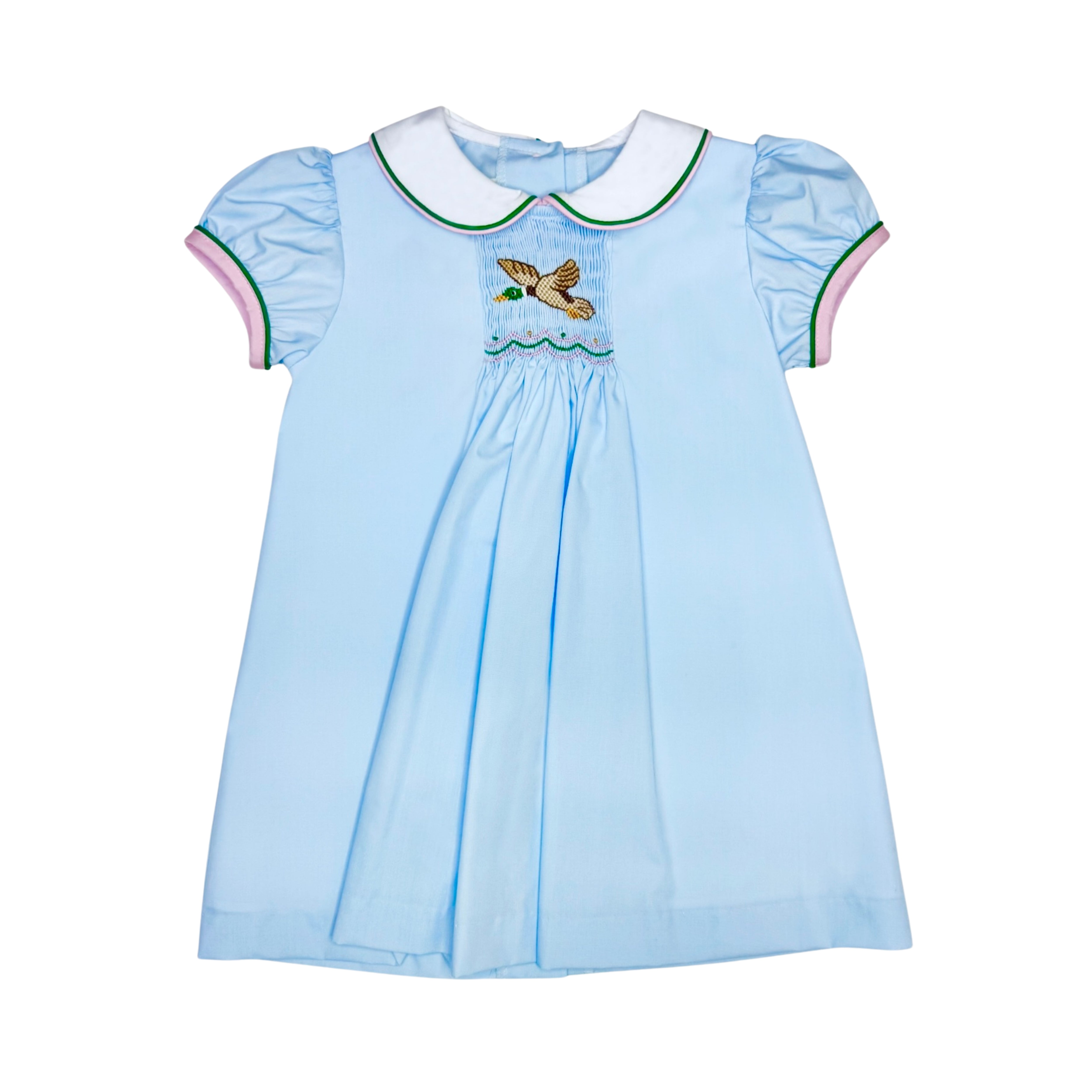 The Mallard Duck Sylvie Dress features soft, light blue broadcloth fabric that ensures comfort and breathability. Its classic texture adds a gentle charm, perfect for everyday wear or special occasions.