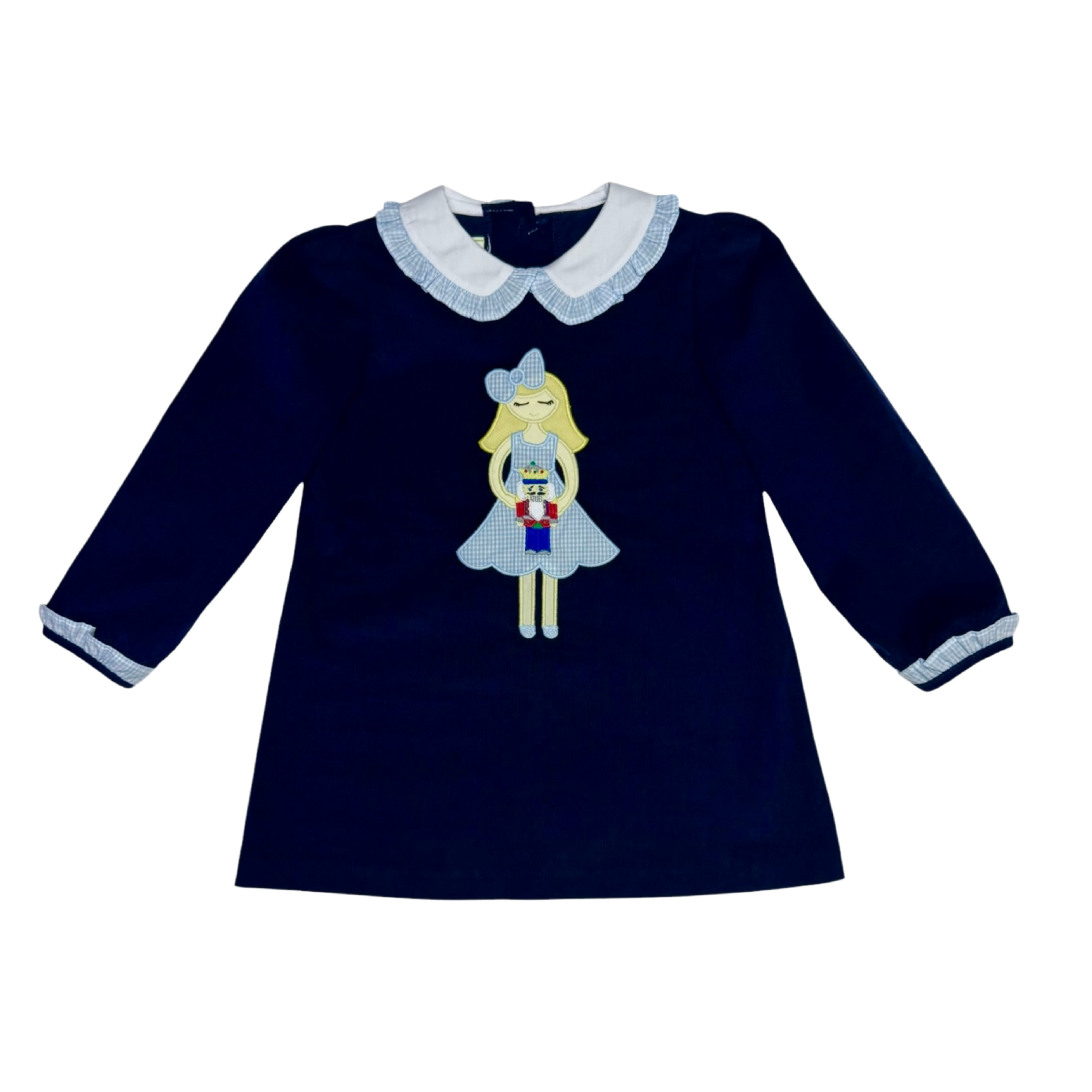 A classic navy cord dress with a darling Nutcracker appliqué — perfect for twirling through the season’s sweetest moments.