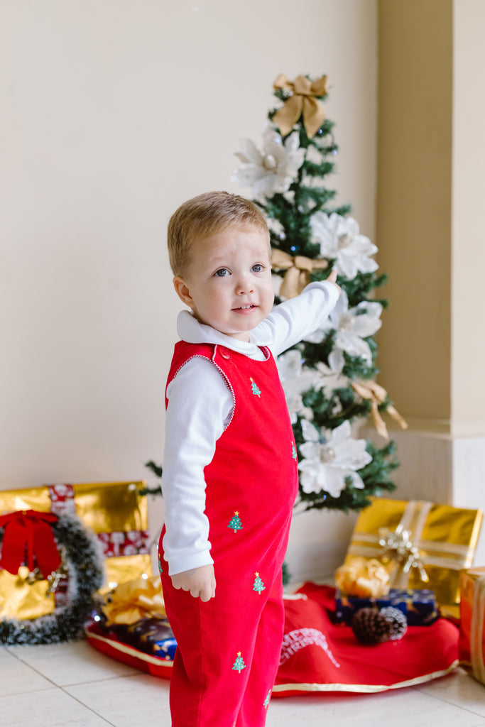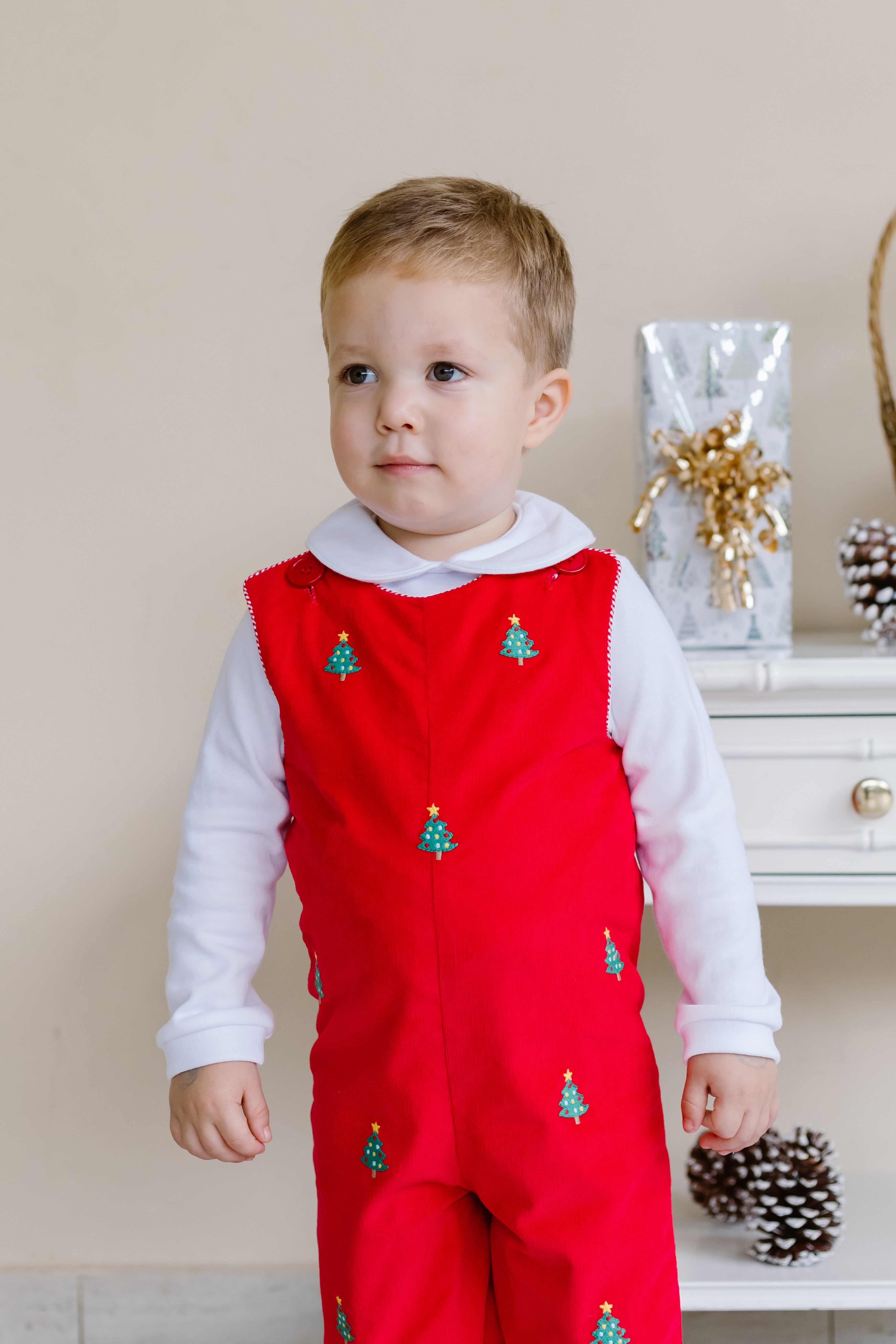 A timeless Christmas favorite! This red cord longall with embroidered Christmas trees is perfect for your little gentleman’s holiday adventures.