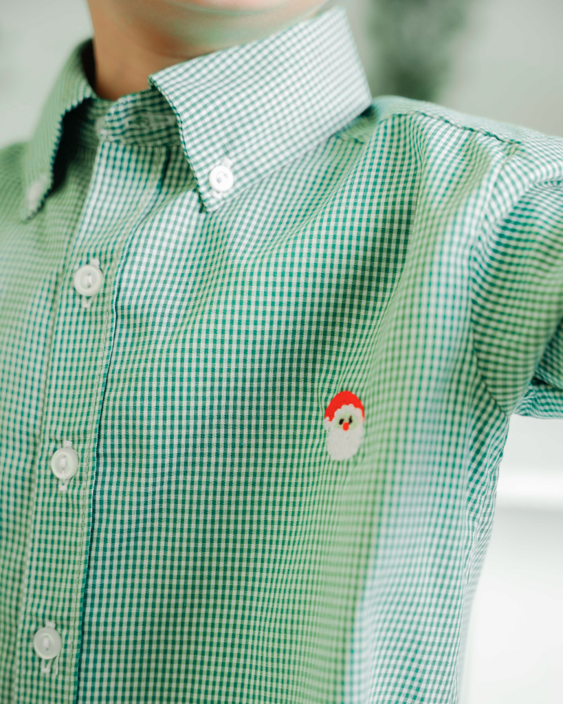 Ho-ho-holiday fun! This green check shirt with an embroidered Santa face is full of festive cheer — perfect for your little one’s merry mischief.