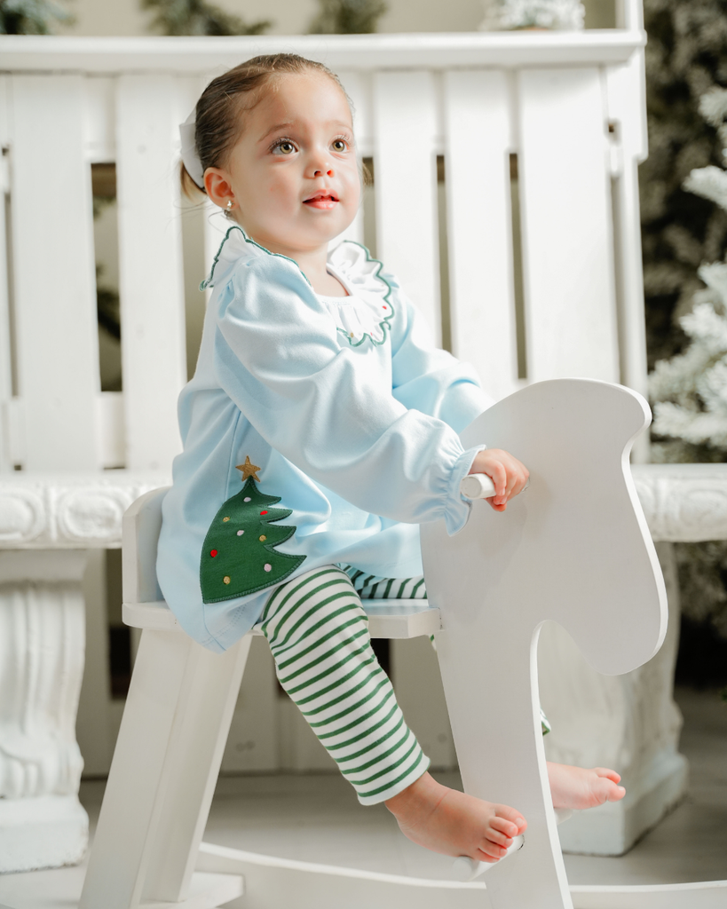 A sweet winter look for your little girl! This light blue knit top with a festive Christmas tree appliqué pairs perfectly with Christmas green thin stripe leggings — made for twirls, giggles, and holiday cookie fun!