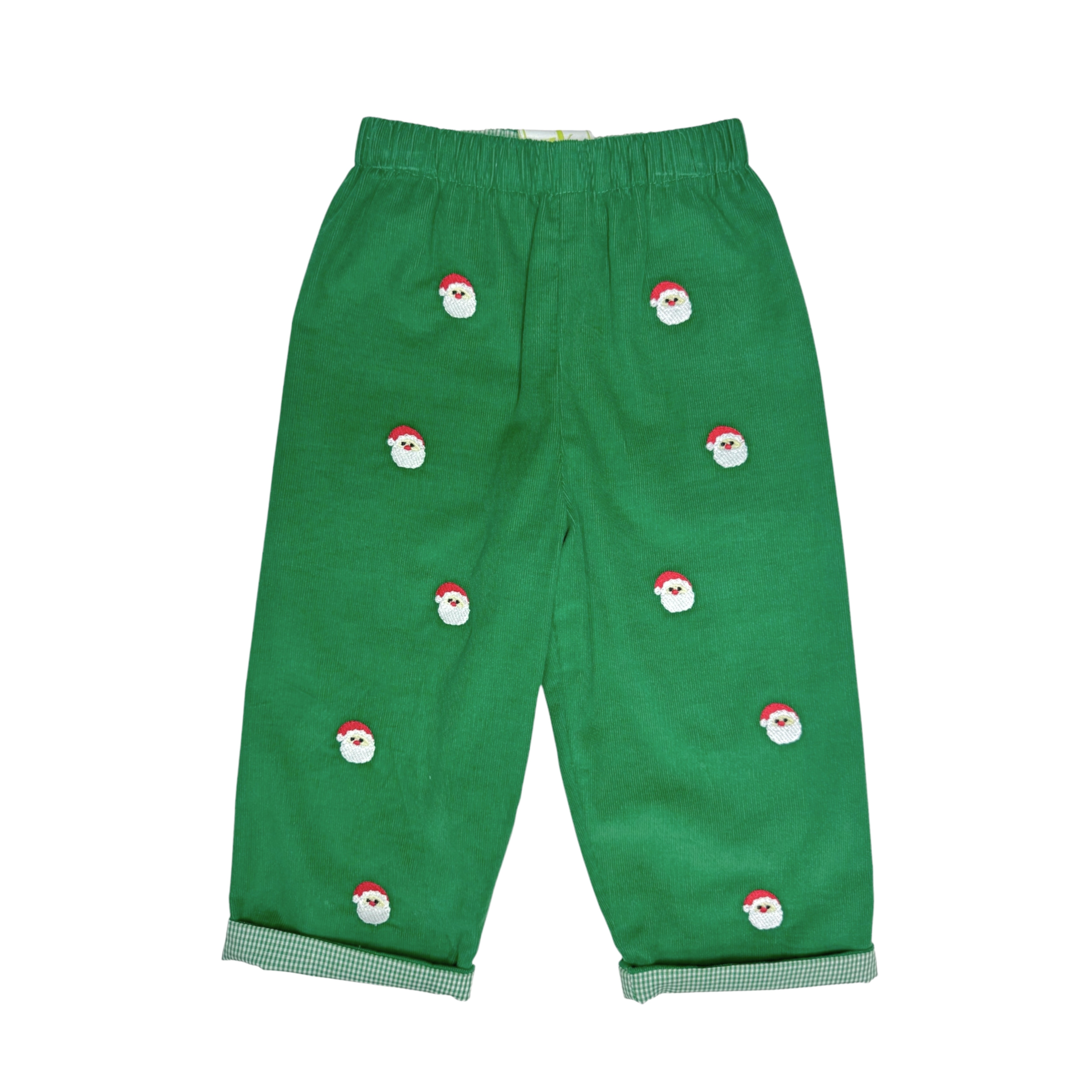 Bring the Christmas cheer! These soft green cord pants with embroidered Santa faces are perfect for pairing with your favorite festive top.