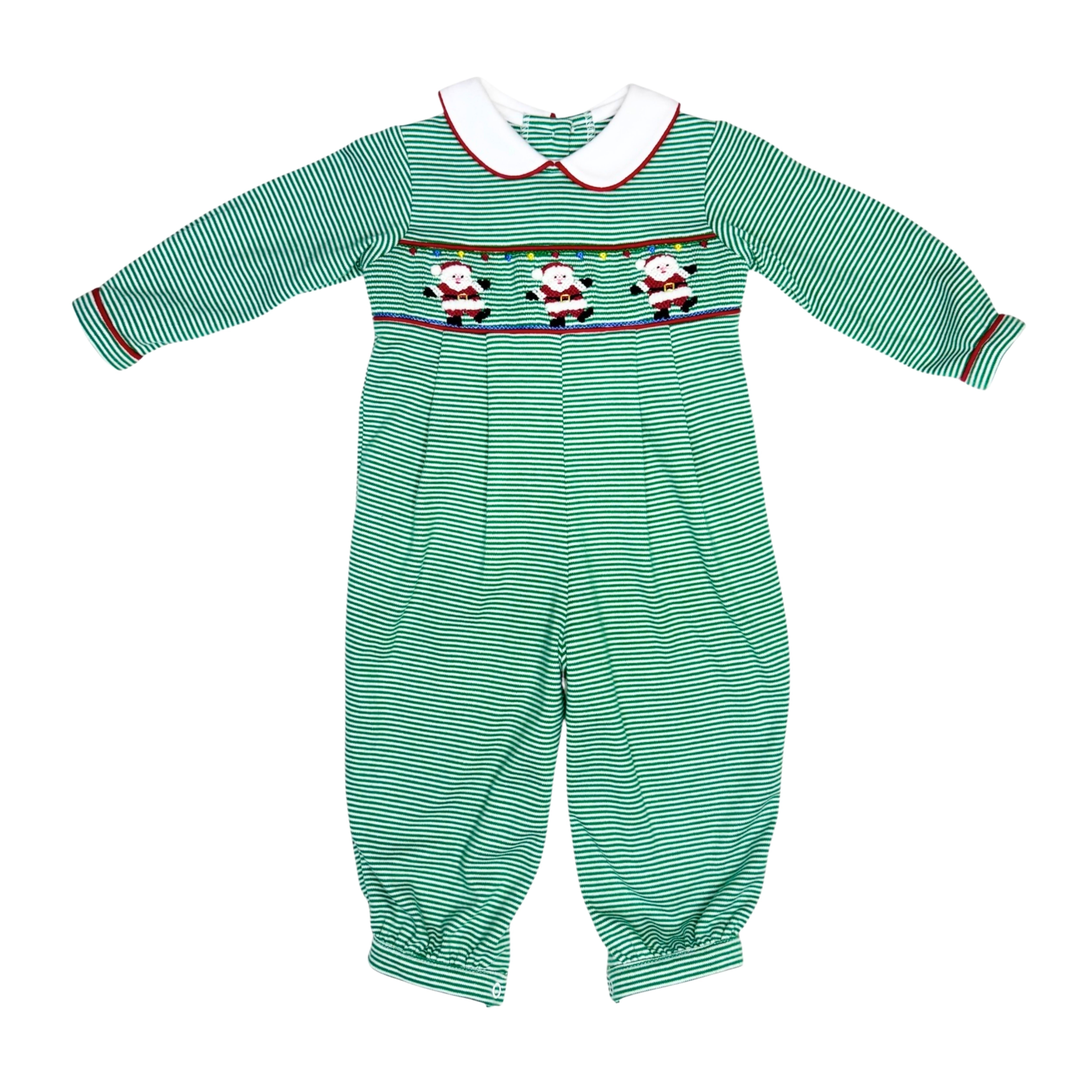 Jolly and bright! This green knit bubble with Santa smocking adds a festive touch to every giggle and cuddle.